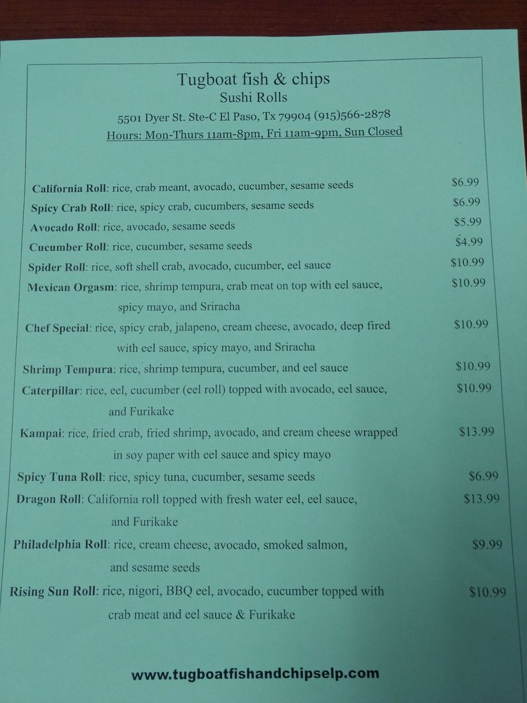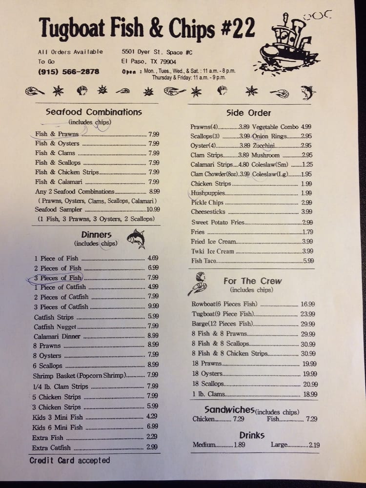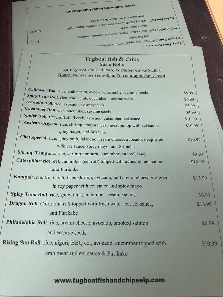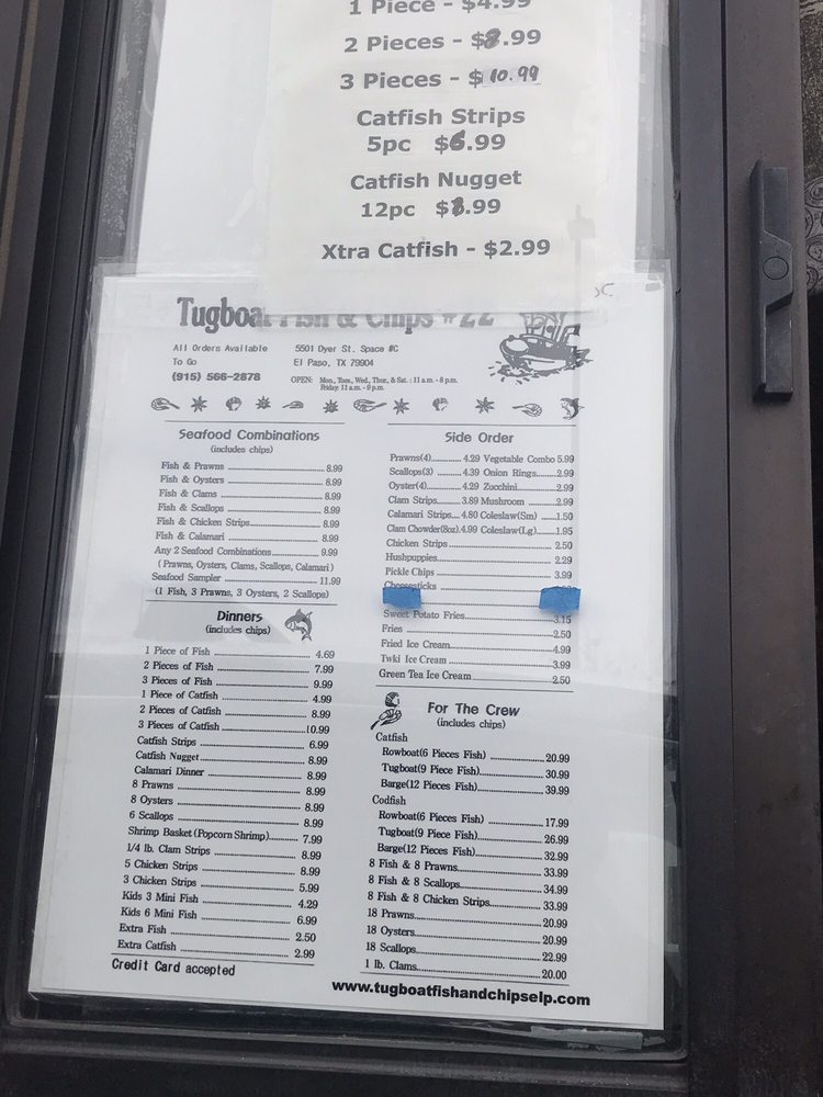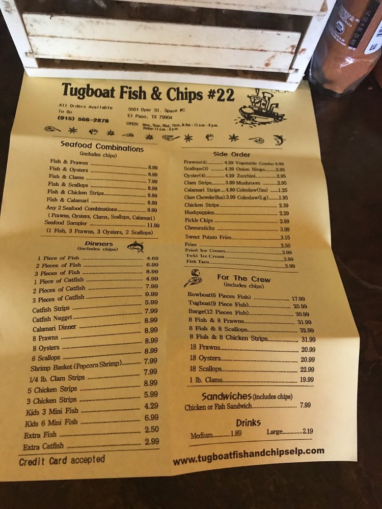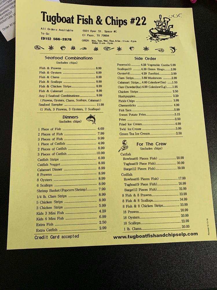 Introducing the menu at Tugboat Fish and Chips, located at 658 Blossom Hill Rd, San Jose, CA, is an exciting culinary adventure that pays homage to classic seafood dishes. A must-try is their Fish & Scallops combo for just $8.99, a delightful pairing that showcases the freshness of the ocean. For those craving variety, the For The Crew options, like the $33.99 Fish & Prawns platter, deliver generous portions that are perfect for sharing. Vegetarian options like crab cakes and hush puppies also shine, with the crab cakes earning rave reviews for their seasonal flavor and perfect frying. The commitment to quality is evident, as customers frequently praise the non-oily, well-cooked fish. While the fries might need a touch more seasoning, the delightful house-made tartar sauce elevates every bite. With consistently fantastic food and friendly service, Tugboat Fish and Chips is a seafood lover's dream.
